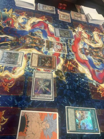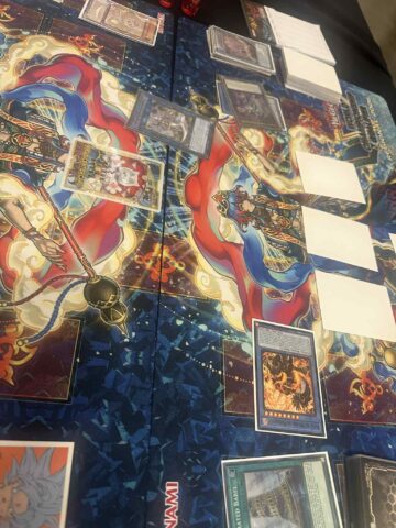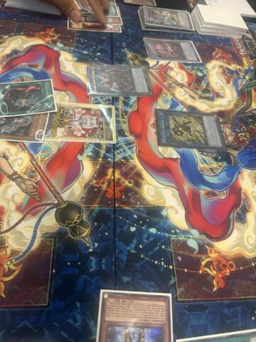 Corrao began his turn by Normal Summoning Orcust Harp Horror, then using it to Link Summon Galatea-I, the Orcust Automaton! He activated its effect, discarding Orcust Cymbal Skeleton to search for Orcustrated Babel, then activated the effect of Ame no Habakiri no Mitsurugi in hand, Special Summoning from Deck and then Tributing Mitsurugi no Mikoto, Saji and searching for Mitsurugi Ritual. He activated Ritual, Special Summoning Habakiri from his hand by Tributing Mitsurugi no Mikoto, Aramasa and Mitsurugi no Mikoto, Kusanagi from Deck, then activated their effects to search for Futsu no Mitama no Mitsurugi and add Mitsurugi Ritual back to hand. He activated Ritual again, Tributing Habakiri to Special Summon Ame no Murakumo no Mitsurugi from the Deck, then activated the Habakiri’s effect to Special Summon it from the Graveyard and search for Mitsurugi Mirror. He then activated Mirror, Tributing Murakumo from hand to Special Summon Futsu no Mitama no Mitsurugi from hand. Corrao activated the effect of the Murakumo in his Graveyard, but Harris Chained the effect of both copies of Mulcharmy Meowls from his hand! Corrao Special Summoned Murakumo and searched for Mitsurugi Great Purification, as Harris drew Turbo Booster and Yummy☆Surprise