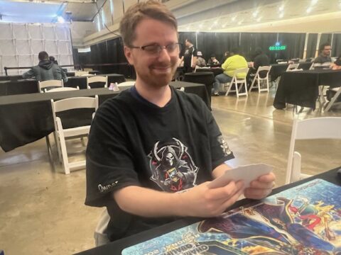 Alex Mondlak and Steven Gleason currently have 10-3 records in the tournament and are sitting at table 13 in Round 14. Now, they’re facing off against one another! While it’s likely that both Duelists will fall just short of the Top 8 cut, they’re still competing for the special Top 16 Effect Veiler promo card; the Top 32 Card Trooper promo card; and the Anotherverse Stratios Game Mat that only the Top 32 will earn. There are great prizes on the line, so both Duelists will be giving this Match their all. Mondlak is using an unconventional R.B. Sky Striker strategy while Gleason is piloting a Branded Dracotail Deck. It’s time to Duel!
