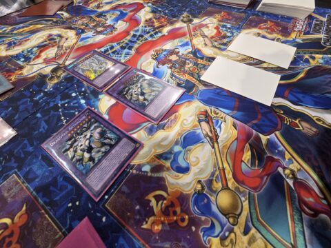 Leishman led with Foolish Burial Goods, sending The Black Goat Laughs to the Graveyard. He Normal Summoned Orcust Harp Horror, and Salcedo used Heavenly Spheres, Tributing it to return Harp Horror to the hand. In a new Chain, Heavenly Spheres brought Mululu to the field. Leishman used Super Polymerization, discarding Harp Horror to fuse Gulamel and Mululu into Predaplant Dragostapelia! Salcedo flipped Sting, returning Harp Horror to Leishman’s Deck, then returning Lukias to his own Deck and drawing Ghost Belle & Haunted Mansion! Leishman played Foolish Burial, and Salcedo negated that with Ash Blossom. He moved to the Battle Phase and attacked with Dragostapelia, but Salcedo used Horn to return it to the Extra Deck, then returned Sting to his Deck and drew Bystial Magnamhut.