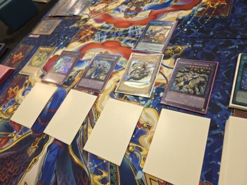 He started things off by Normal Summoning Lukias, adding Dracotail Faimena to his hand. He played Ketu Dracotail next, adding Dracotail Pan to his hand. He used Faimena’s effect, fusing Pan with Urgula into Dracotail Arthalion! Urgula’s and Pan’s effects Set Rahu Dracotail and Dracotail Flame on the field, and Arthalion put Pan and Faimena back in his hand. He used Lukias to Link Summon Spirit with Eyes of Blue, then used that and Arthalion to Link Summon Hieratic Seal of the Heavenly Spheres. He flipped up Rahu, fusing Faimena from his hand and Dracotail Mululu from his Deck into Dracotail Gulamel. Faimena’s and Mululu’s effects Set Dracotail Sting and Dracotail Horn. He used Urgula’s Graveyard effect to return Faimena to his hand.