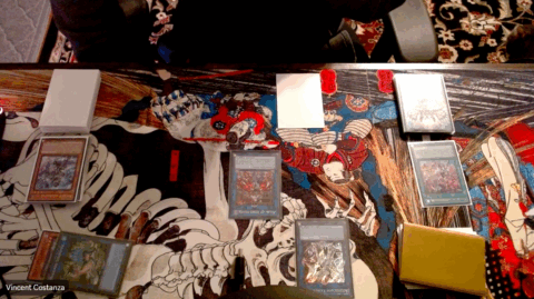 Carlson activated Pre-Preparation of Rites to add Mitsurugi Mirror and Ame no Habakiri no Mitsurugi from his Deck to his hand. He activated Habakiri’s effect in his hand and Costanza activated his Allied Code Talker’s effect by Tributing White Binder to negate the activation of Habakiri’s effect and banish Habakiri. Next, Carlson Normal Summoned Lollipo☆Yummy and activated its effect targeting the Hearts Crypter in Costanza’s Graveyard to return it to the Deck; but Costanza Chained GWC-06 to Special Summon the Hearts Crypter and gain 2500 Life Points. He used Hearts Crypter’s effect and returned the banished Dormouse to his Deck to banish Lollipo☆Yummy. Carlson activated Sky Striker Mobilize – Engage! next, adding Sky Striker Mecha – Hornet Drones from his Deck to his hand. He activated it to Special Summon a Sky Striker Ace Token and then Costanza flipped MTP-07. He added a March Hare from his Deck to his hand and banished the Token. Next, Carlson activated Yummy Surprise to Special Summon Cupsy☆Yummy from his hand. He activated its effect to add Marshmao☆Yummy from his Deck to his hand and then Special Summoned Marshmao☆Yummy from his hand with its effect. He used its effect to return Yummy Surprise from his Graveyard to his hand and then sent Marshmao to the Graveyard to Link Summon Yummy★Snatchy. He activated its effect to place Yummyusment☆Mignon from his Deck into his Field Spell Zone and then activated Yummyusment☆Mignon’s effect to Special Summon Marshmao from his Graveyard. Next, he activated Surprise. He targeted his own Snatchy and targeted Costanza’s Allied Code Talker and Crypter. Carlson Chained Snatchy’s effect to Tune it with a monster and Synchro Summon Cupsy★Yummy Way, and then Surprise’s effect resolved to return Allied Code Talker and Crypter to Costanza’s Extra Deck. Carlson then activated the effect of Cupsy★Yummy Way in a new Chain, adding Cooky☆Yummy and Cupsy☆Yummy from his Deck to his hand and discarding Mitsurugi Mirror. Next, he Special Summon Cooky☆Yummy from his hand and used its effect to reduce Red Ransom’s ATK by 1000. He Special Summoned Cupsy☆Yummy from his hand next and then attempted to enter his Battle Phase, threatening to wipe out all of Costanza’s Life Points. Costanza activated his March Hare’s effect in the hand during the Main Phase. He banished White Binder from his Graveyard to Special Summon the March Hare in Defense Position and then paid 900 Life Points to Special Summon his banished White Binder and draw a card. He used his White Binder’s effect to banish Surprise and Snatchy from Carlson’s Graveyard, and banish March Hare from his own Graveyard. Carlson Chained the effect of Cupsy★Yummy Way to Special Summon Yummy★Snatchy. After White Binder’s effect resolved, Costanza paid 300 Life Points to return his banished March Hare to his hand. On resolution, Costanza activated the effect of Nibiru, the Primal Being! With Carlson’s entire field suddenly wiped out by Nibiru, Carlson conceded.