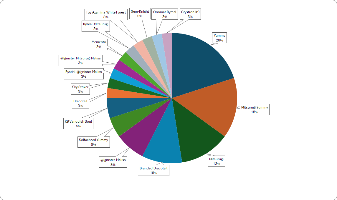 The remaining Decks have shifted around a bit, with Solfachord Yummy, Memento, Gem-Knight, and Toy Azamina White Forest appearing, new from last round. We’ve got two more rounds to go, so we’ll know soon which Decks will make the cut to Top 8!