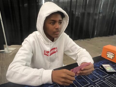 Luis drew Cooky☆Yummy on his first turn and added it to his hand of Triple Tactics Talent, Ash Blossom & Joyous Spring, and Sky Striker Mecha – Hornet Drones. He activated the Hornet Drones in his Standby Phase to Summon a Sky Striker Ace Token and then used the Token as a Link Material to Summon Sky Striker Ace – Kagari. He used Kagari’s effect to return Hornet Drones to his hand and then activated it to Summon another Token. He Special Summoned Cooky☆Yummy from his hand and activated its effect to try to lower Little Knight’s ATK by 1000, but Michael Chained his Little Knight’s effect to banish Cooky and Little Knight until the End Phase. Luis activated Triple Tactics Talent next, sending the last card in Michael’s hand – Ash Blossom & Joyous Spring – back to Michael’s Deck. Michael immediately conceded, realizing he was defeated.