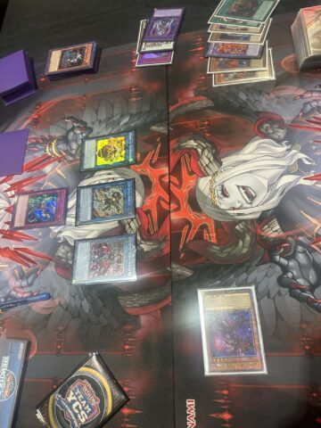 Eichelberger began by activating Gold Sarcophagus and banishing Maliss <P> Dormouse from his Deck. He Special Summoned back the Dormouse, then activated its effect to banish Maliss <P> Chessy Cat from his Deck. Next, he Special Summoned back the Chessy Cat, then activated its effect, banishing Maliss <P> March Hare from his hand to draw 2 cards! Eichelberger added March Hare back to hand, as Ramirez-Medina Chained the effect of Droll & Lock Bird! Eichelberger then used Dormouse to Link Summon Linguriboh, then Set a card to his backrow. He Normal Summoned Ghost Belle & Haunted Mansion, then used all three of his monsters to Link Summon Maliss <Q> Red Ransom! He activated Maliss <C> TB-11, banishing Red Ransom to Special Summon another Chessy Cat from his Deck, then activated Red Ransom’s effect, Special Summoning it back to the field and banishing Maliss <P> White Rabbit from his Deck. He activated White Rabbit’s effect, Special Summoning it back to the field and Setting Maliss <C> MTP-07 to his backrow. Eichelberger used Chessy Cat, Red Ransom, and White Rabbit to Link Summon Maliss <Q> Hearts Crypter, then activated the effect of Wizard @Ignister in his hand, Special Summoning it from hand and White Rabbit from the Graveyard. Finally, he used Hearts Crypter, White Rabbit, and Wizard to Link Summon Allied Code Talker @Ignister. However, when he activated its effect, Ramirez-Medina activated the effect of Nibiru the Primal Being! The Allied Code was Tributed, and Ramirez-Medina Special Summoned a Primal Being Token to Eichelberger’s side of the field.